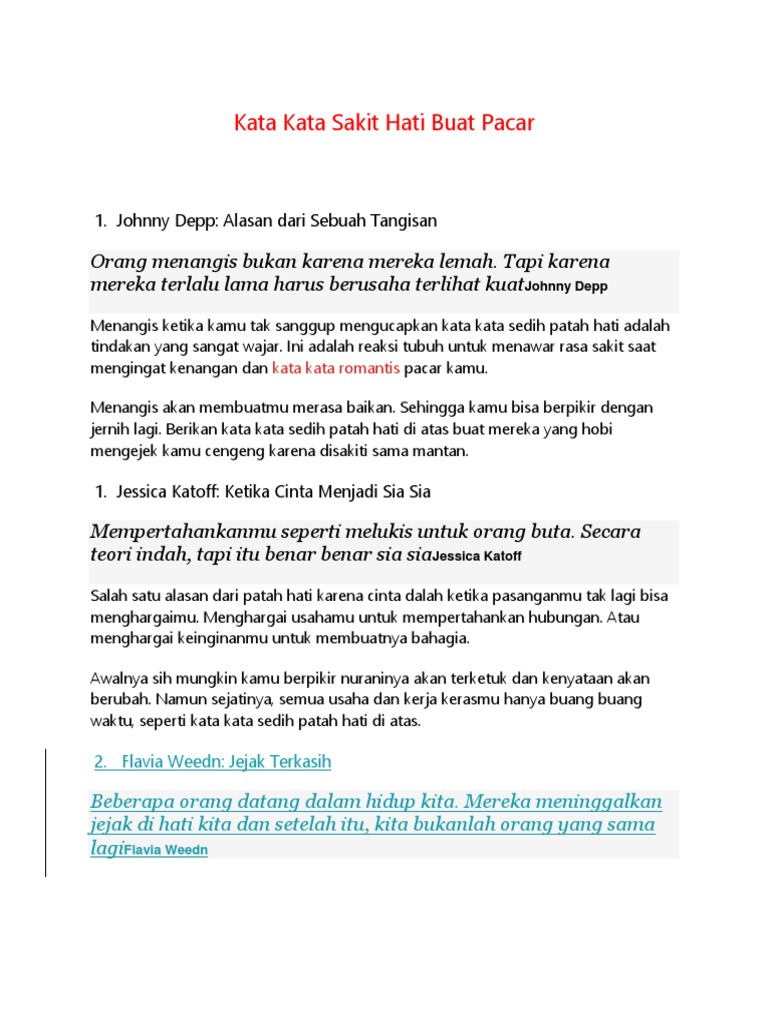 Kata kata paling sedih dan paling bisa buat nangisperjuangan cinta satu pihak duration. Kata sindiran buat pacar yang berubah cuek berikut ini bisa jadi kode buatnya lebih perhatian dan memahami perasaanmu. Kata-kata sedih buat pacar yang berubah cuek dan nggak pengertian.